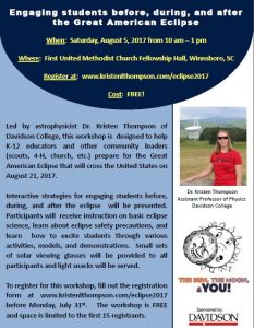 To honor the work of Professor Witherow, I will be leading this workshop which is designed to help K-12 educators and other community leaders (scouts, 4-H, church, etc.) prepare for the eclipse. Interactive strategies for engaging students before, during, and after the eclipse will be presented. Participants will receive instruction on basic eclipse science, learn about eclipse safety precautions, and learn how to excite students through various activities, models, and demonstrations. Small sets of solar viewing glasses will be provided to all participants and light snacks will be served. This workshop is FREE but limited to the first 15 registrants.